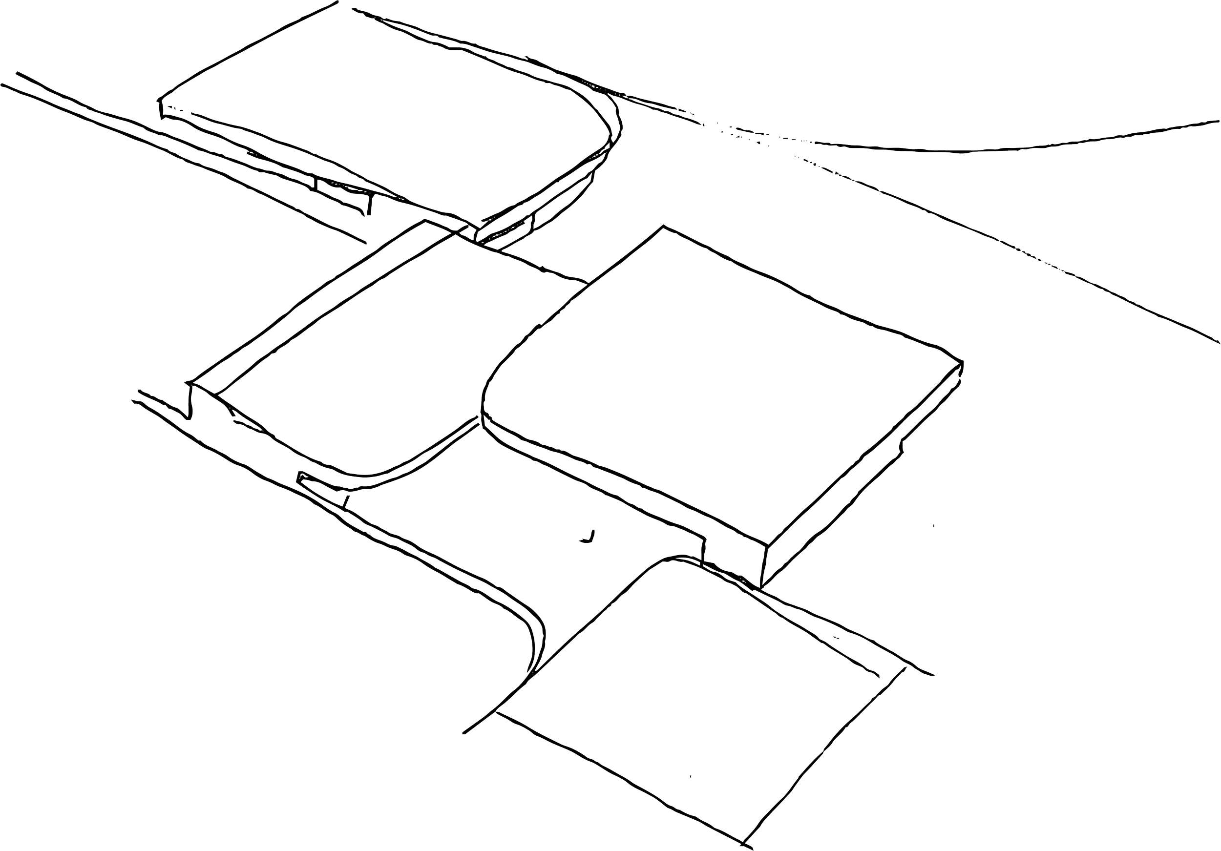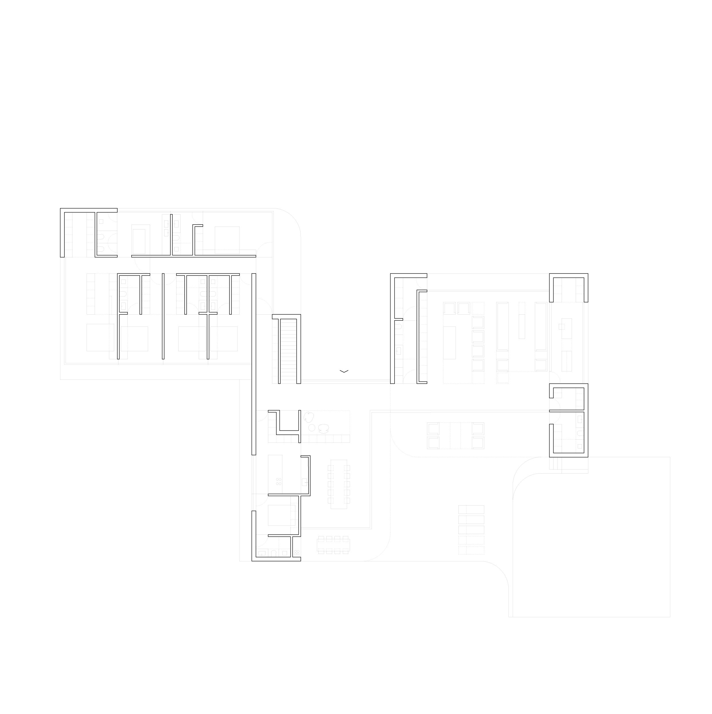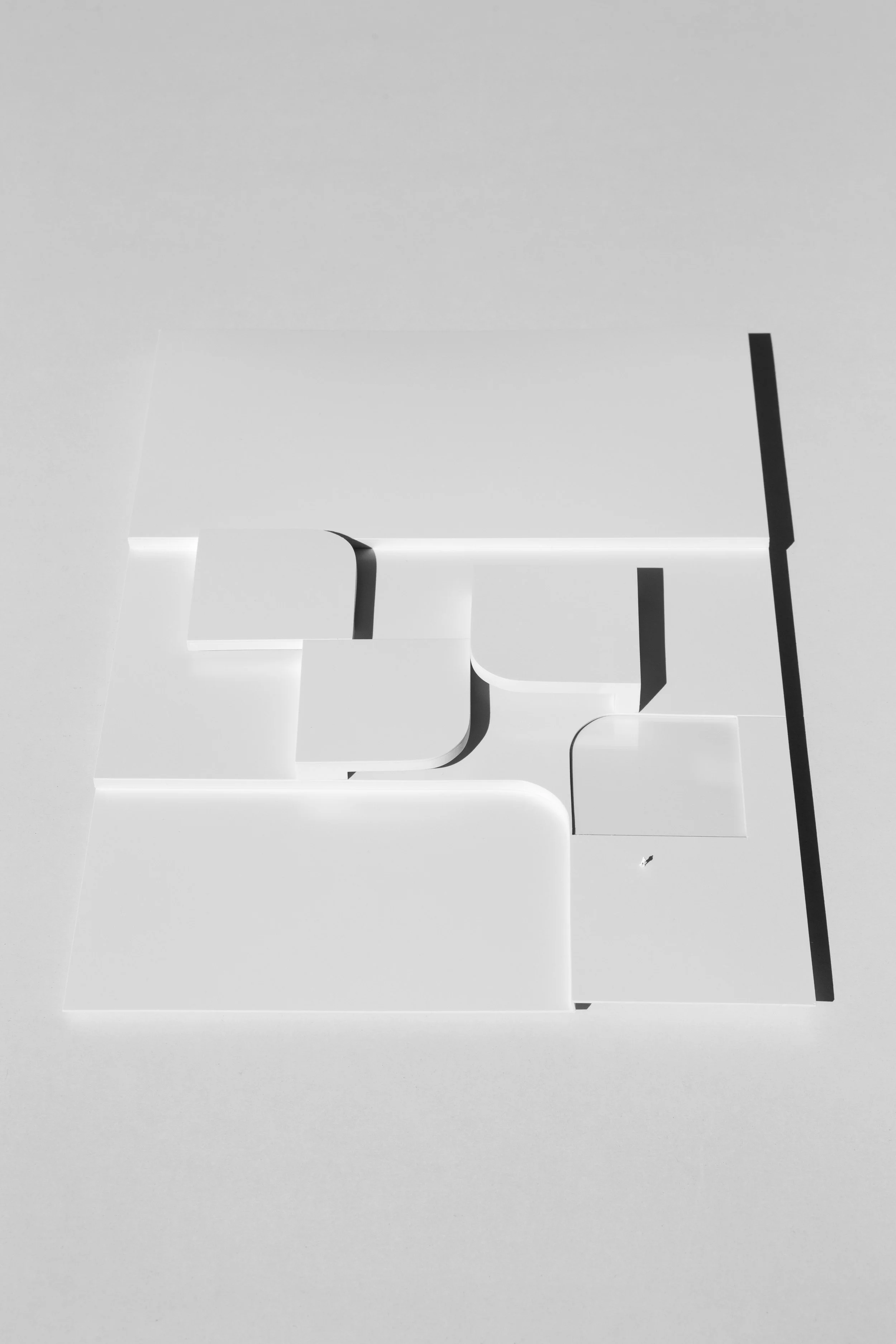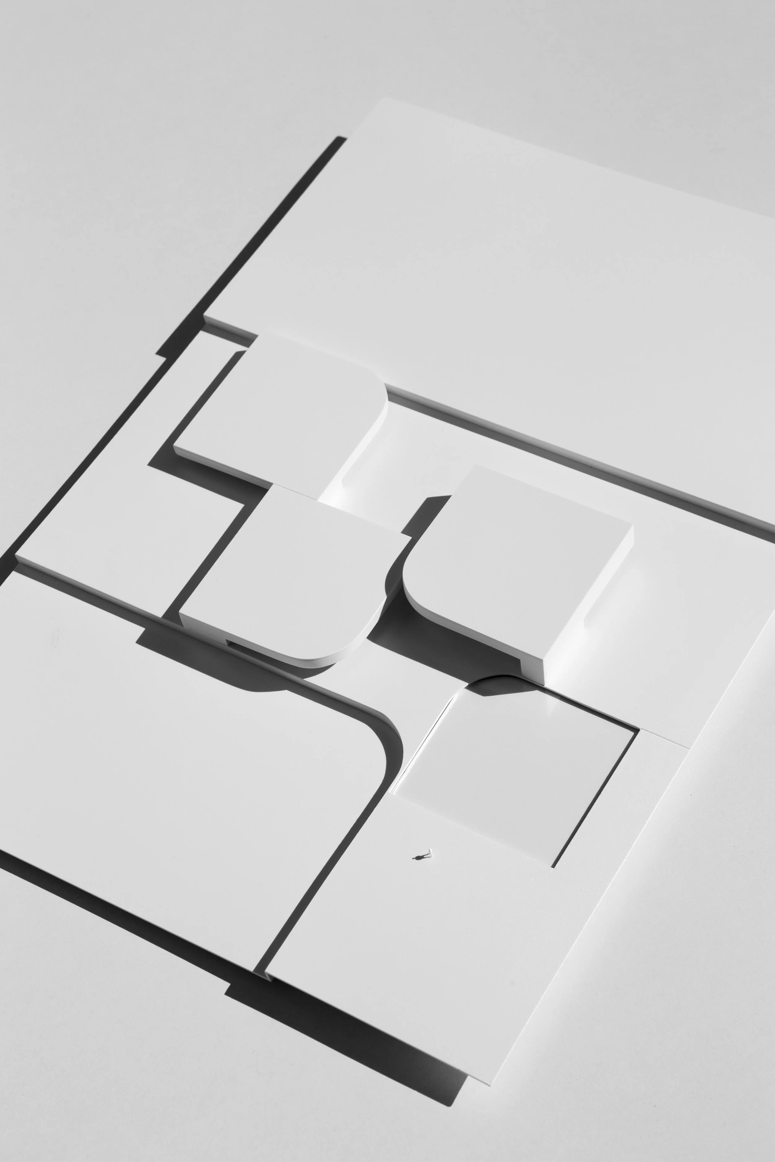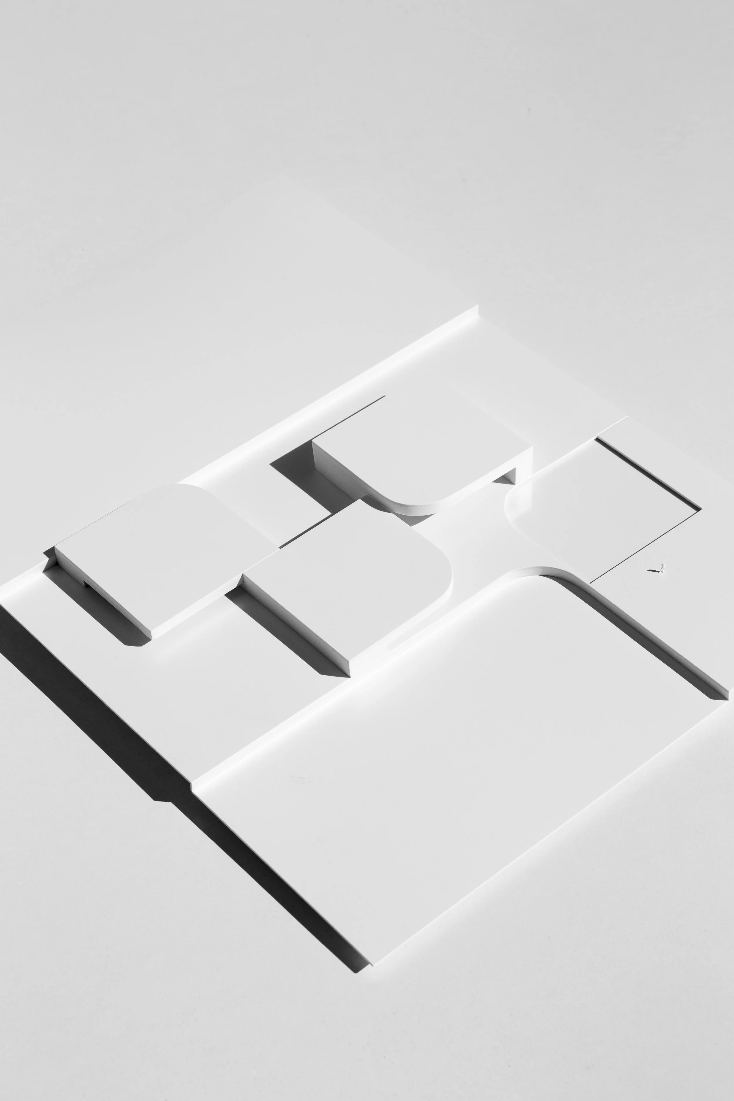 La Villa se organiza en tres volúmenes de diferentes alturas dispuestas orgánicamente sobre plataformas irregulares. Sus perímetros de pareds curvas se conectan generando espacios vacíos que dan lugar a patios en los que se desarrollan diversos usos.