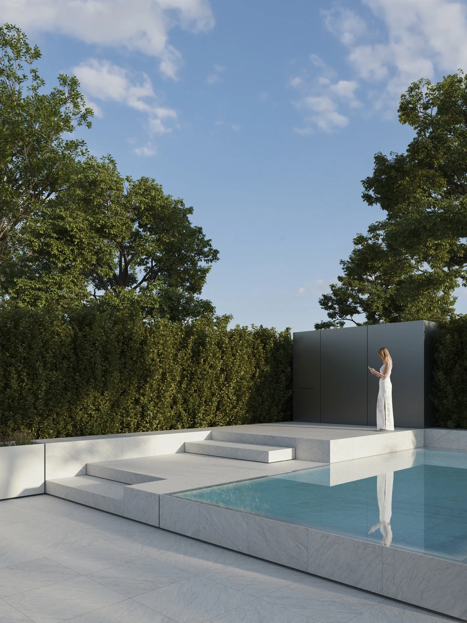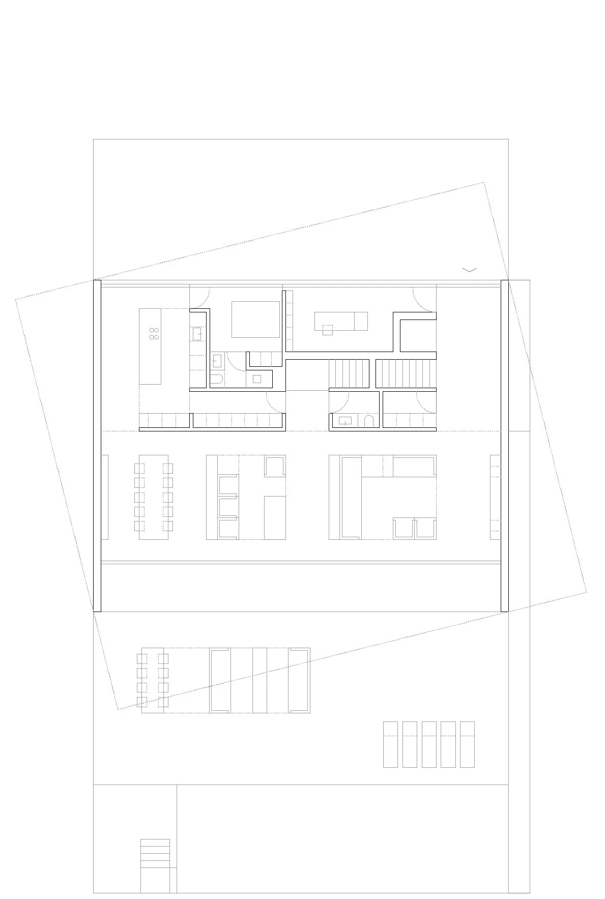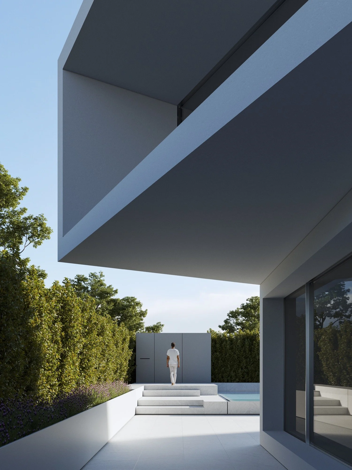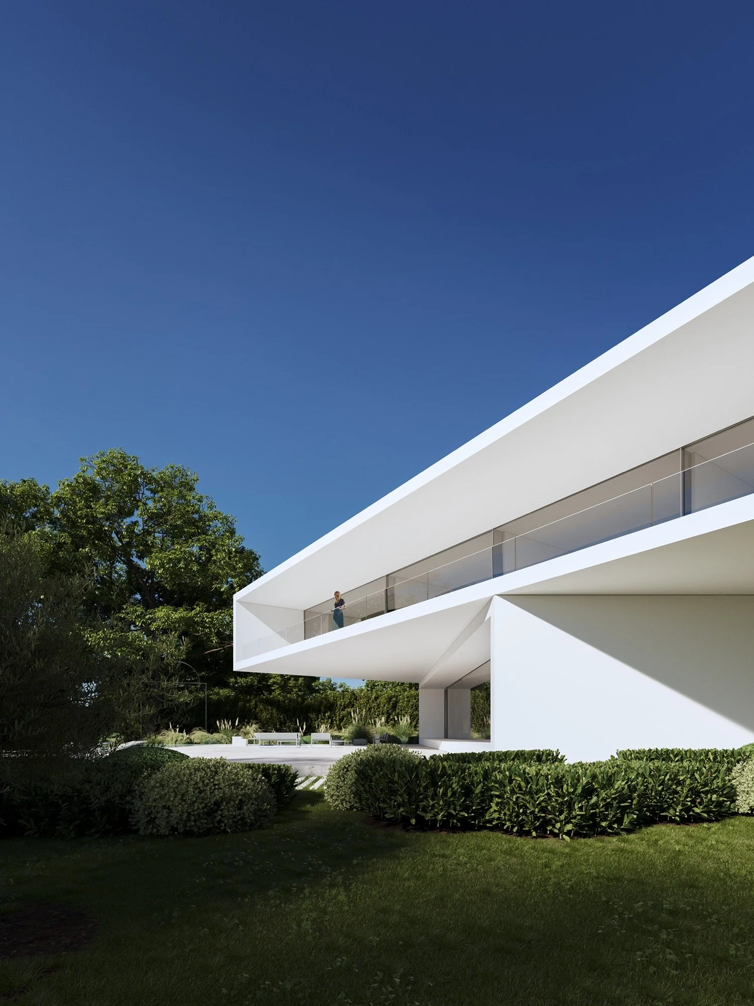 Esta villa se presenta como una superposición de dos volúmenes muy rotundos, que a través del juego que plantea el giro entre ellas, generan terrazas cubiertas y orientan la planta superior en la dirección de las vistas distantes del paisaje. Las piezas tienen dos lados sólidos que desempeñan la función estructural, permitiendo así que los frentes estén completamente abiertos a través de grandes ventanas orientadas hacia el jardín con una horizontalidad marcada.